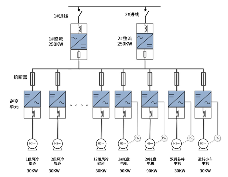 在山西某大型钢铁集团一条线材生产线传动装置使用年份较长,目前该变频器超期服役急需更换,于是客户提出进行国产化替代,以满足生产要求及节能降本增效。