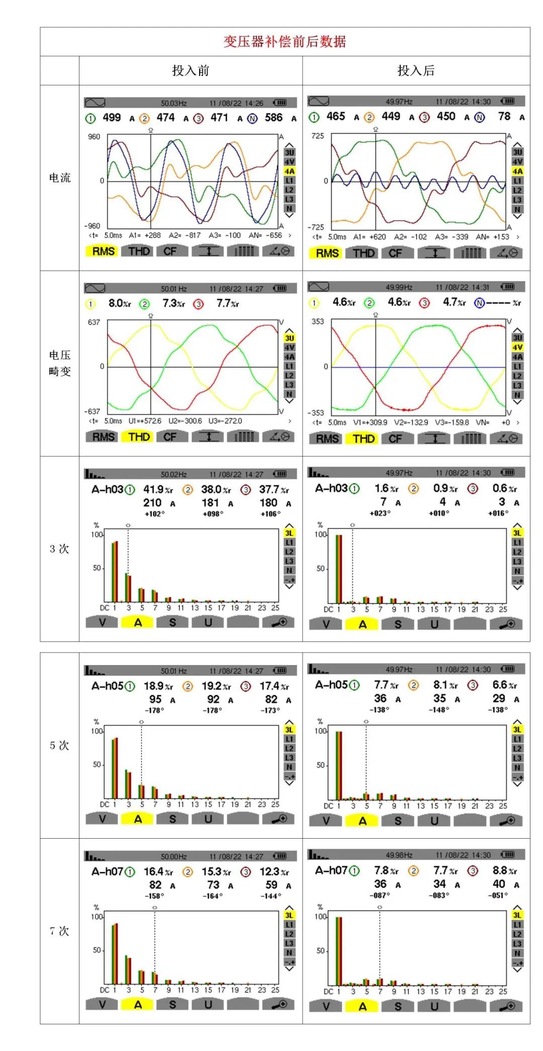 说明:从上面的数据记录可以看出,APF投入后,电压畸变全部下降到国标5%以内,N线电流由586A下降到78A,主要次谐波3、5、7次分别下降到了4、29、34,补偿效果比较好。