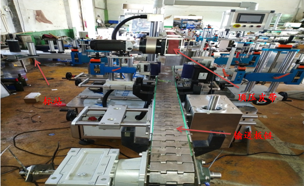 贴标行业的直线贴标机设备由输送板链、顶压皮带、分瓶器、理瓶器和三个标站组成,三个标站分别贴正标、背标、脖标,实现对全瓶身贴标的高贴标精度和高贴标速度需求。