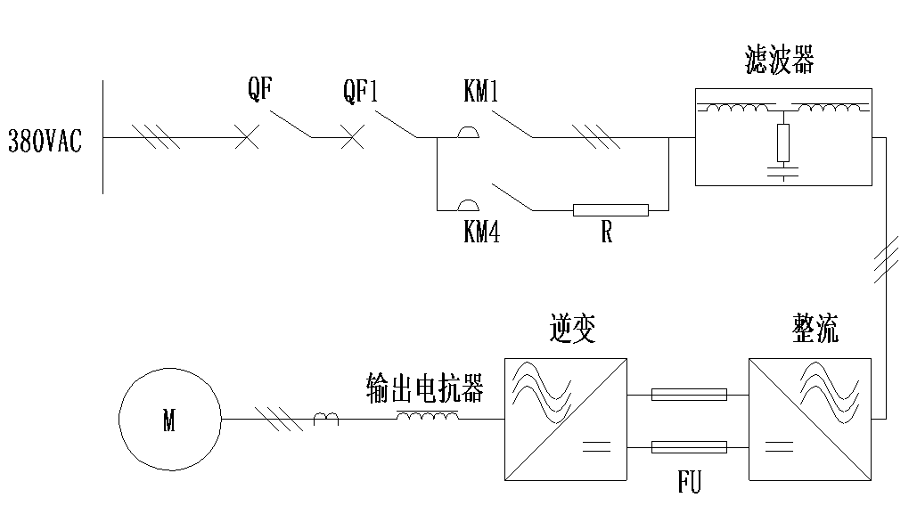 本次英威腾的方案,主回路主要由用户开关QF,变频器输入主断路器QF1,缓冲接触器KM4,主回路接触器KM1,LCL滤波器,整流单元,逆变单元以及输出电抗器几部分组成。