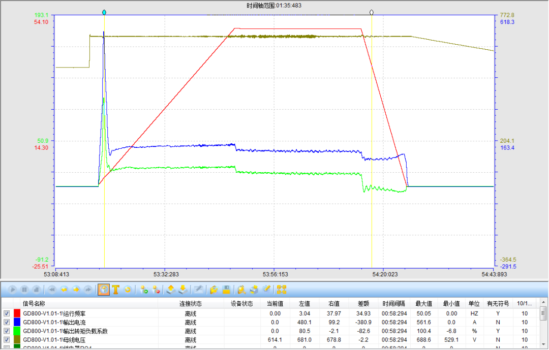 启动波形:皮带机空载启动,从输出转矩曲线判断,皮带机停止时由于皮带机存在惯性,电机处于临界发电状态