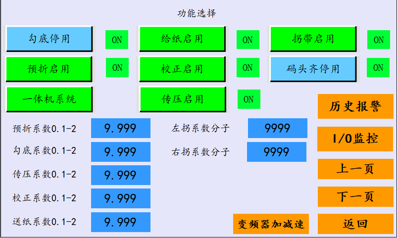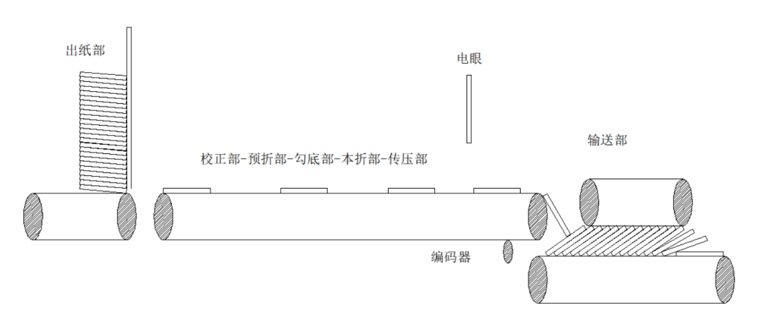 输送变频配合出料电眼,限高电眼,编码器,控制出料输送带速度、启停,达到出料呈鱼鳞状排布效果,其他的变频实现产品的给纸、校正、预折、勾底、本折、传压等动作。