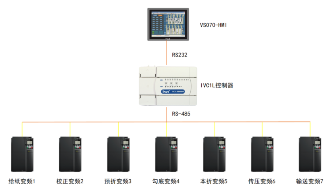 四、大幅降低硬件成本与维护成本。在硬件上,控制器、触摸屏、变频器、伺服全部实现国产替代,成套电控系统成本至少下降20%。整套系统的变频器通过RS485通讯,由上位PLC给定频率,减少了大量模拟量模块、简化了现场布线,降低系统硬件成本,也减少了后期维护成本。