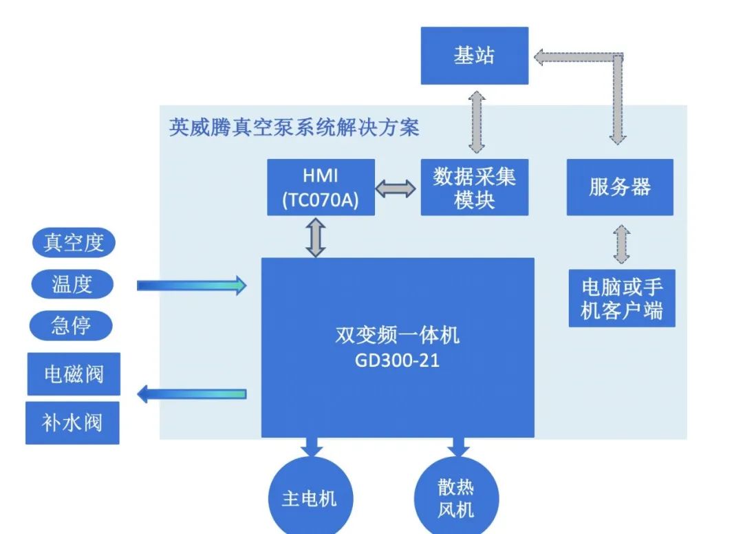英威腾GD300-21系列双变频一体机系统在永磁同步真空泵上的成功应用,为客户提供了更高性价比的变频系统方案,精简的控制系统减少了真空泵故障点,同时也提供了更便捷的一站式服务,使螺杆真空泵的安装和维护变得轻松快捷。