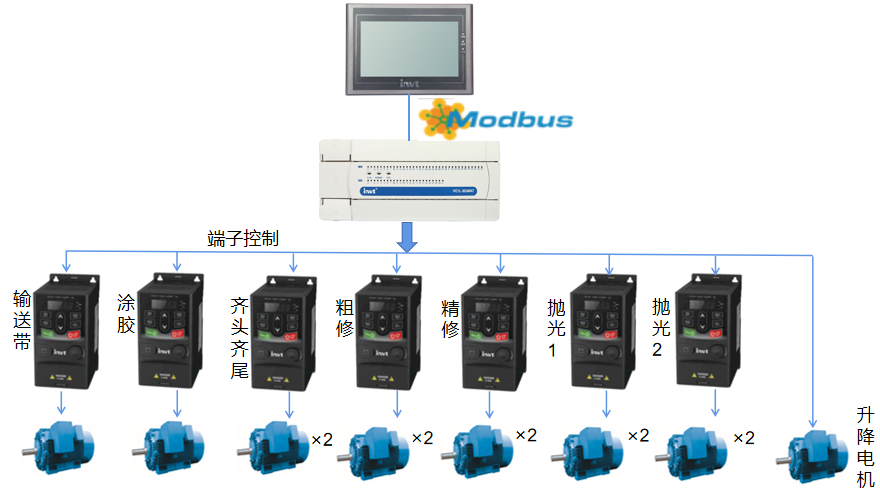 为了实现客户需求,英威腾推出HIM+IVC1微型可编程控制器+Goodrive20系列经济型开环矢量变频器的系统解决方案,该方案主要针对于中大型全自动直线封边机,适用于直角边,能够对不同长度,不同厚度的板材进行封边,是全自动化方案。