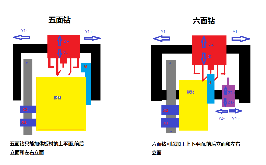 数控六面钻的主要工作原理:编程人员将待加工板材的图纸转换成NC程序传入运动控制系统,控制上下刀库和主轴以及各个进给轴伺服运行。