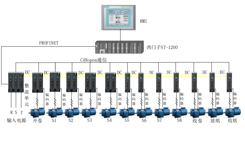根据客户需求,英威腾决定保留原PLC和触摸屏程序保留了原来老的操作方式,采用PN通信进行读写和数据交换,节省了编程时间和工人操作培训成本,在GD600整流和GD800上各安装一块PN通信模块,其中GD600整流和逆变单元之间采用自带的标配CANopen通信以节省通信模块的费用,依托于以下几点产品优势,实现完美的国产化改造。