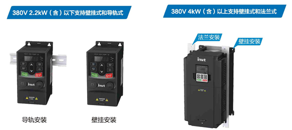 2.2KW(含)以下支持导轨式和挂壁式安装方式;4KW(含)以上支持壁挂式和法兰式安装方式;
