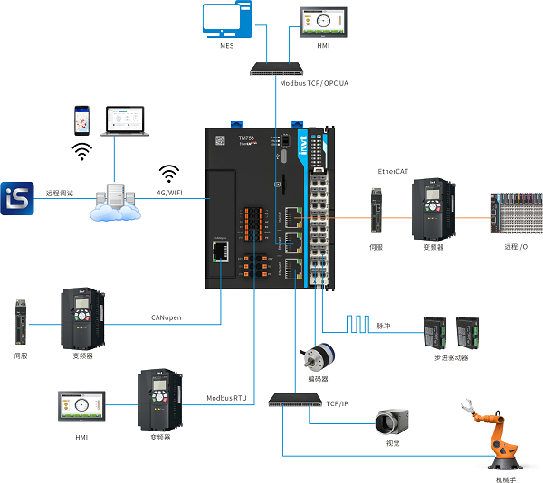 TM700系列高性能可编程控制器主要针对有较高运动控制要求和较复杂控制网络场景,在控制性能、通信能力、编程效率等方面有大幅提升和改善,让您更灵活的搭建控制网络,通过OPC UA更便捷的实现与信息层的数据交互,进一步提升设备节拍、缩短开发周期,带来更卓越的体验。